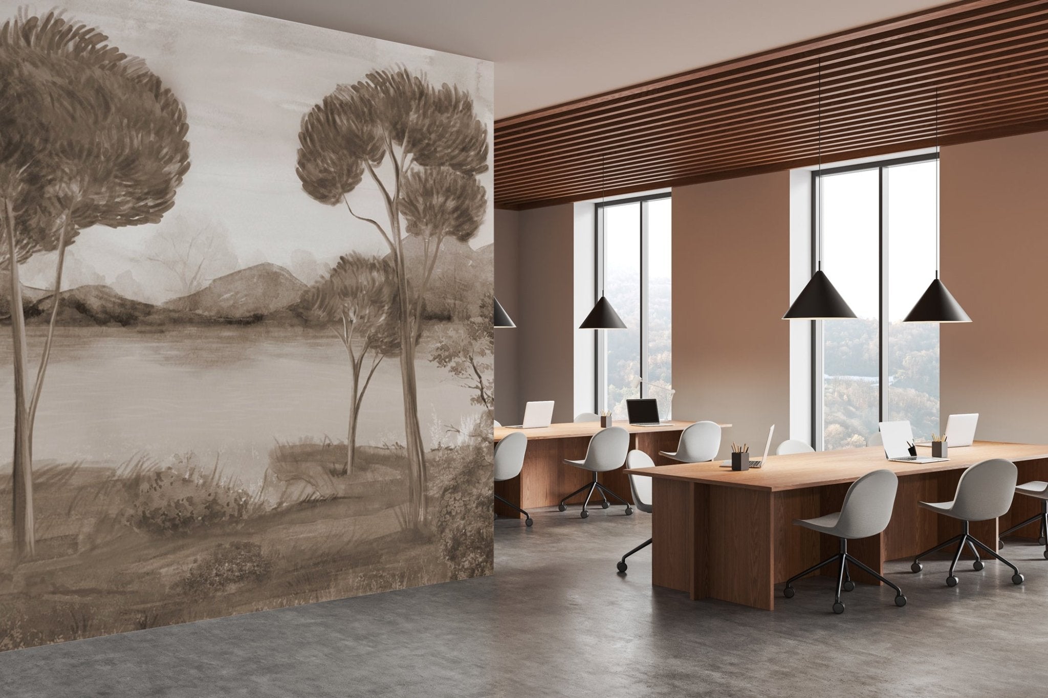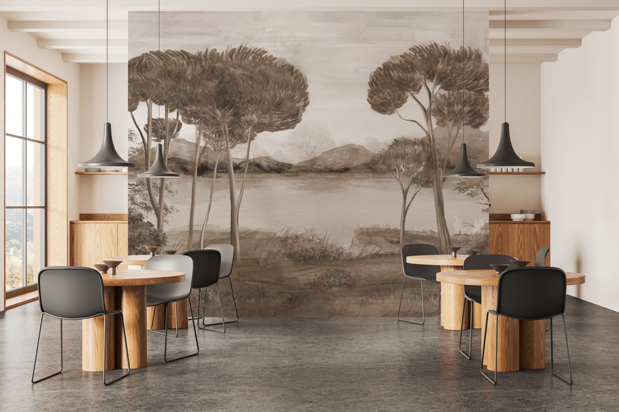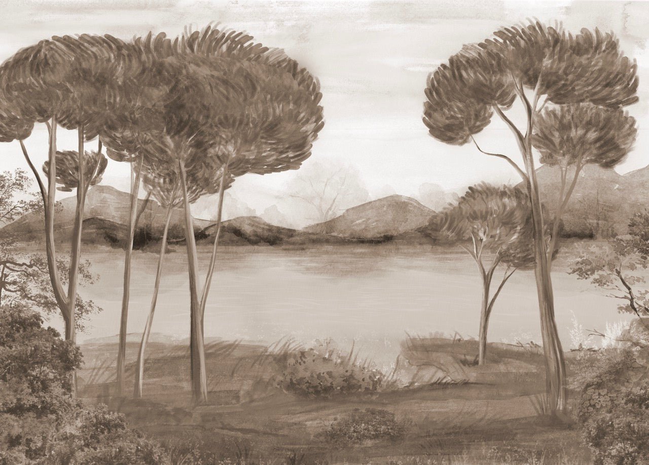 Plongez vos intérieurs dans l’élégance intemporelle avec ce papier peint panoramique sépia, inspiré des paysages méditerranéens. Des pins parasols élancés se dressent au bord d’un lac paisible, dans un style pictural raffiné qui évoque les fresques italiennes anciennes.