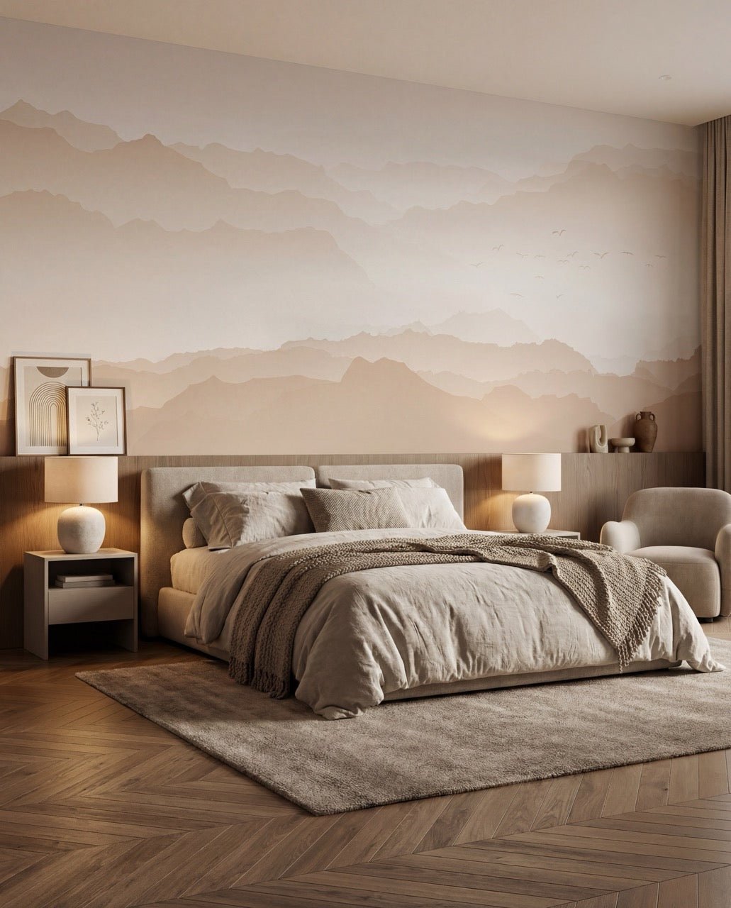 Idéal pour créer une ambiance naturelle, cocooning et contemporaine, ce papier peint montagne beige chaud apporte sérénité, profondeur et élégance à votre intérieur.