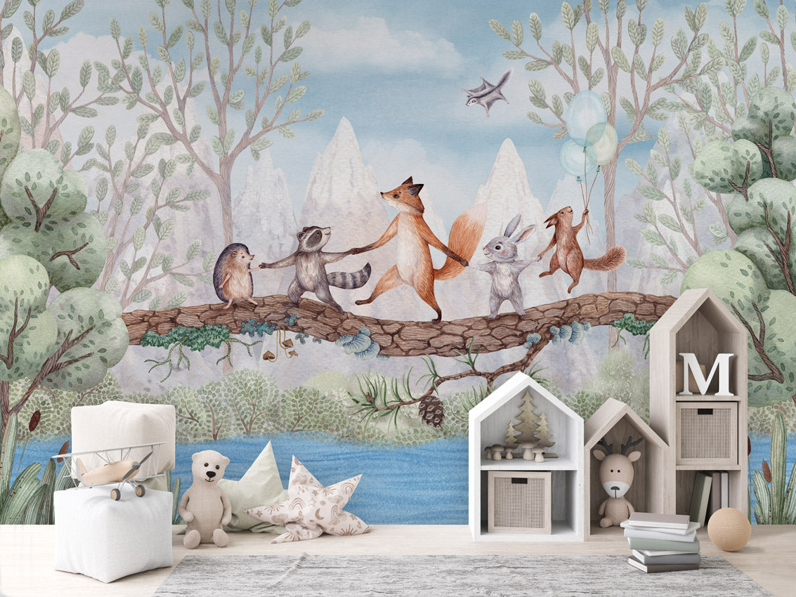 Invitez la joie et la tendresse dans la chambre de votre enfant avec ce papier peint plein de vie et de poésie. Sur une branche au-dessus d'une rivière paisible, une adorable bande d'animaux — renard, lapin, raton laveur et hérisson — se tient la patte pour partager un moment complice et joyeux.