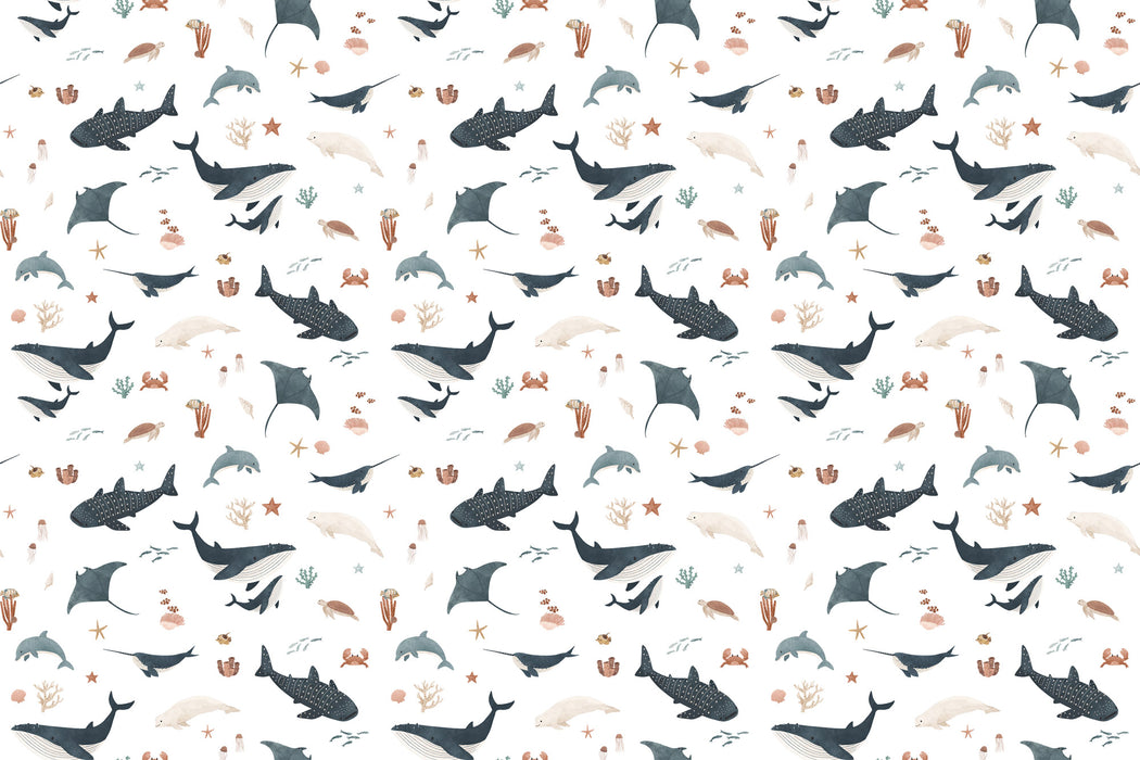 Ce papier peint monde marin pour chambre bébé et enfant invite à une immersion douce dans un univers sous-marin apaisant. Sur un fond clair lumineux, baleines majestueuses, raies gracieuses, petits crabes et poissons colorés évoluent paisiblement parmi des coraux délicats.