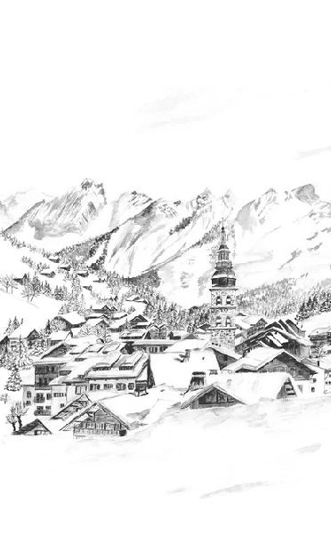 Papier peint panoramique La Clusaz en peinture - Noir et blanc