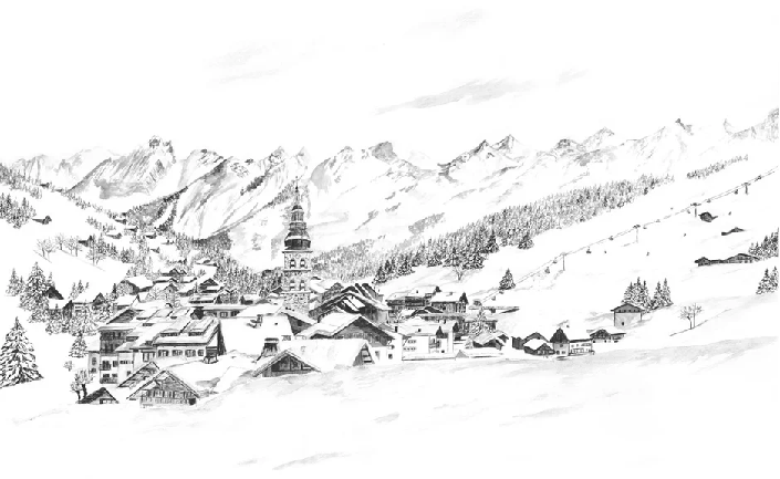 Papier peint panoramique La Clusaz en peinture - Noir et blanc