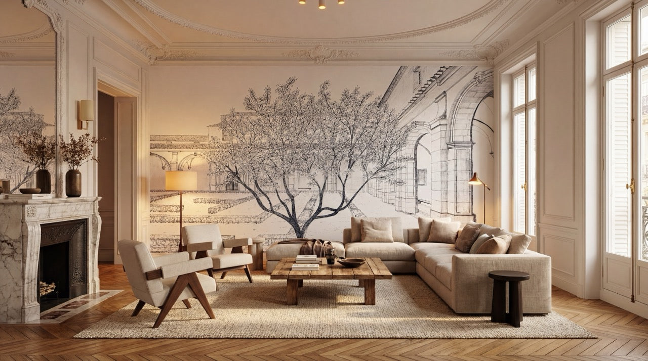 Grâce à son travail de perspective, ce papier peint trompe-l’œil donne de la profondeur aux murs, agrandit visuellement l’espace et crée l’illusion d’un jardin qui se prolonge au-delà de la pièce. Idéal pour un salon, une suite hôtelière, un restaurant ou un projet d’architecture intérieure, ce décor mural transforme l’espace et lui apporte caractère, émotion et singularité.